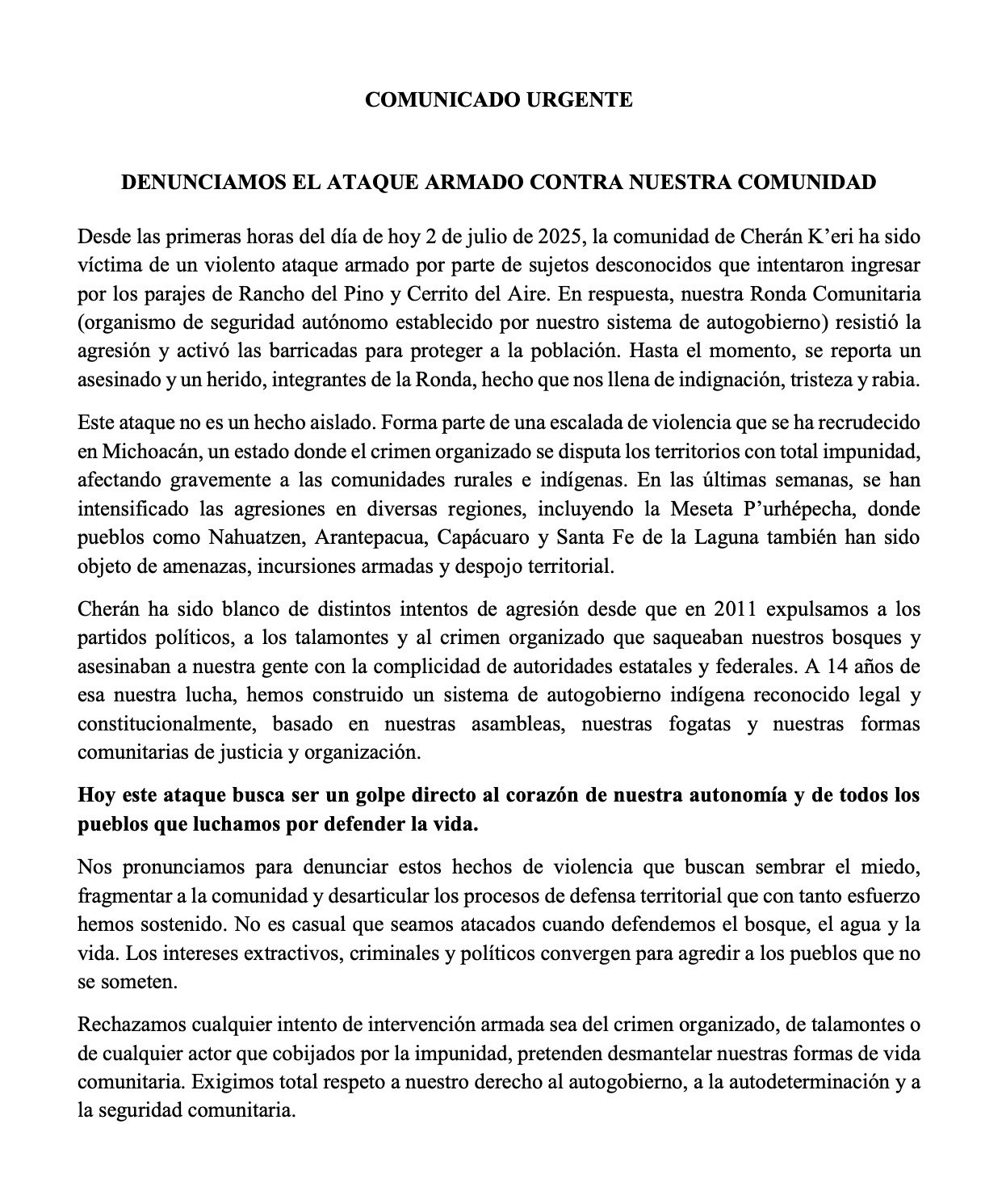 COMUNICADO URGENTE DENUNCIAMOS EL ATAQUE ARMADO CONTRA NUESTRA COMUNIDAD Desde las primeras horas del día de hoy 2 de…